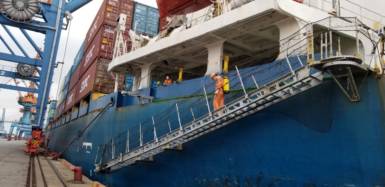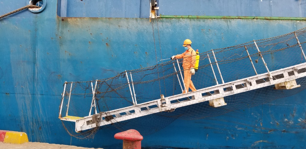 Trong 2 ngày 25-26/3/2020, các lực lượng Y tế, An toàn lao động và công nhân bốc xếp đã phối hợp triển khai phun thuốc khử trùng Chloramin B tại cầu thang lên xuống các tàu neo đậu tại cảng trước khi bắt đầu làm hàng. Trong quá trình phun thuốc đảm bảo trang bị đầy đủ bảo hộ cá nhân như găng tay, khẩu trang; sau khi phun thuốc rửa tay xà phòng, sát khuẩn…