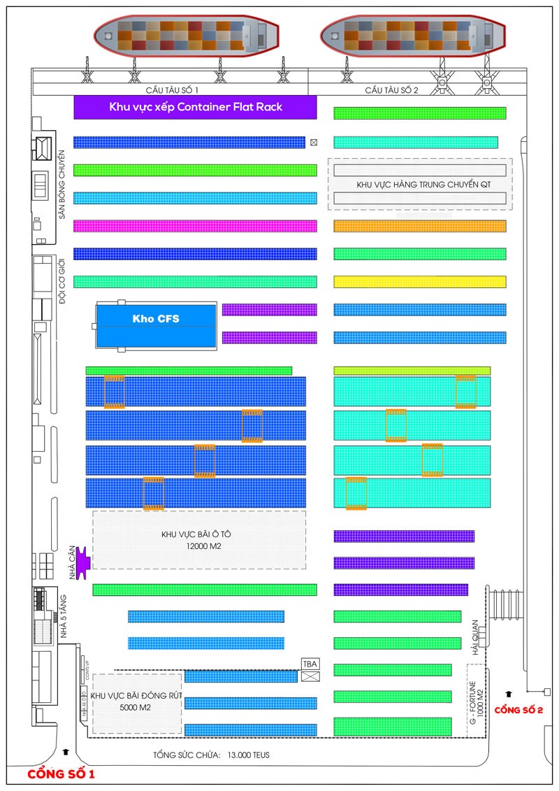 - Diện tích bãi xếp container : 22 Ha ~ 12.500 TEU
